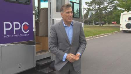 People's Party of Canada leader Maxime Bernier greets reporters in Oromocto, NB. Sept. 17, 2019. Andrew Cromwell/Global News