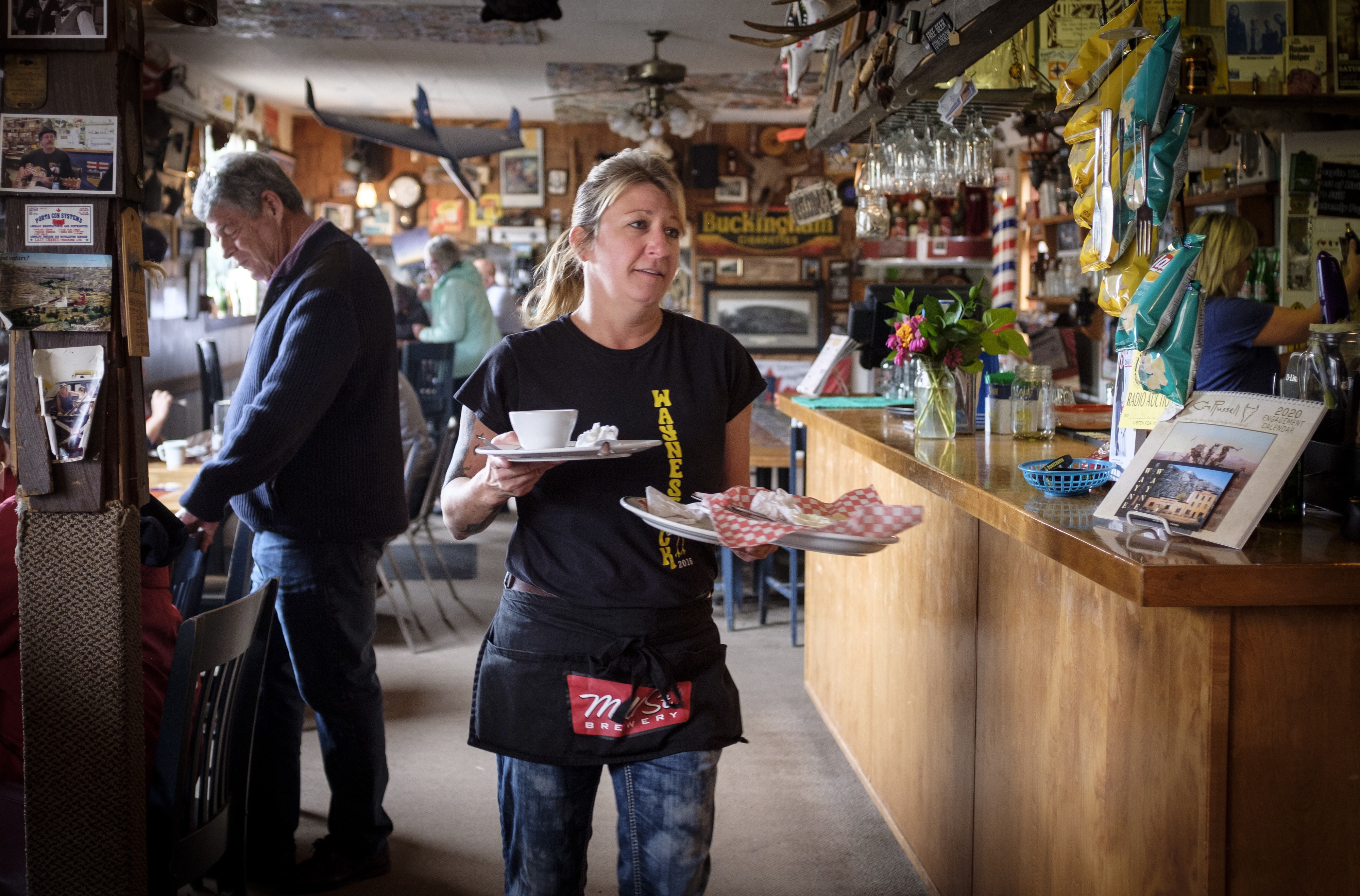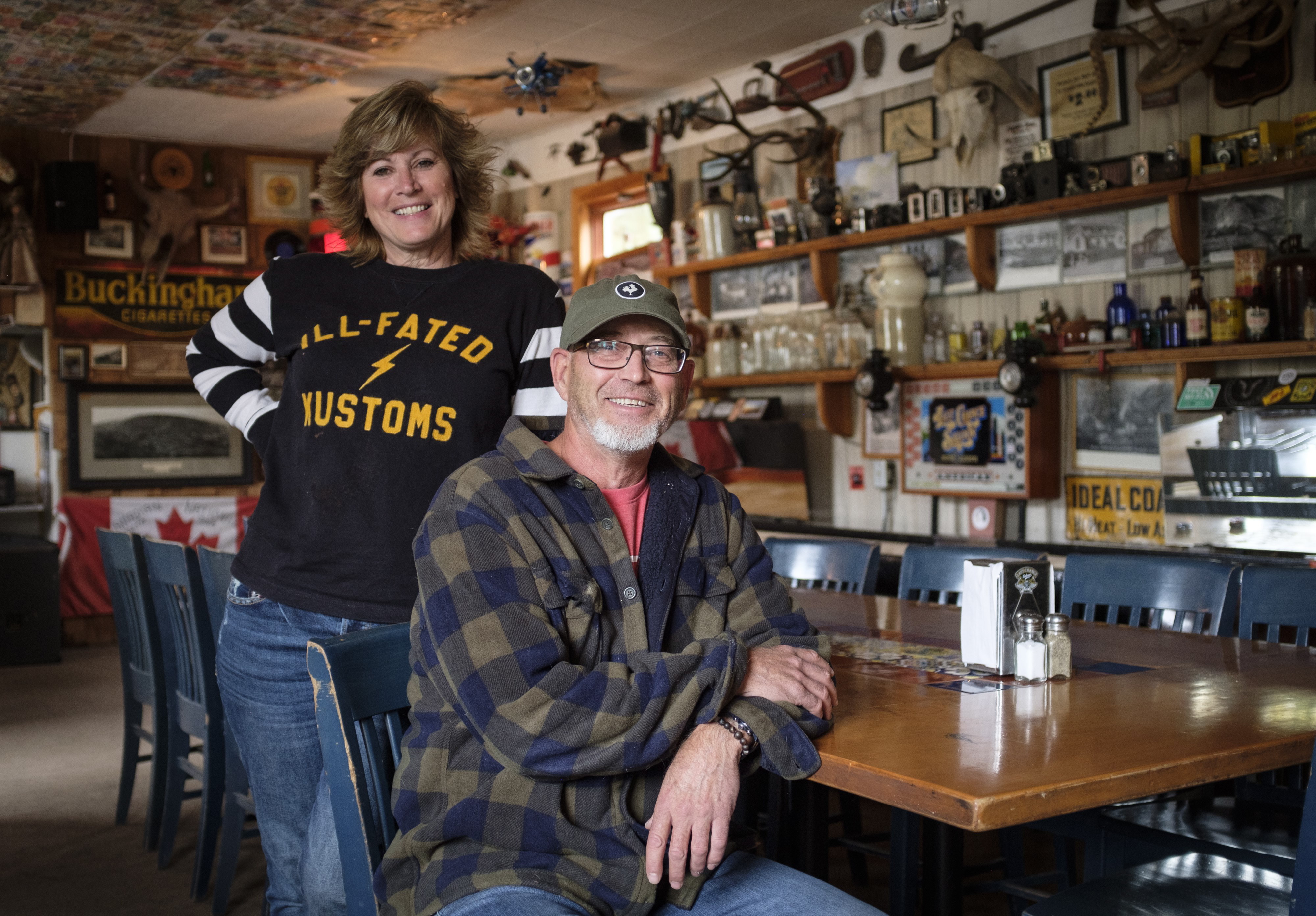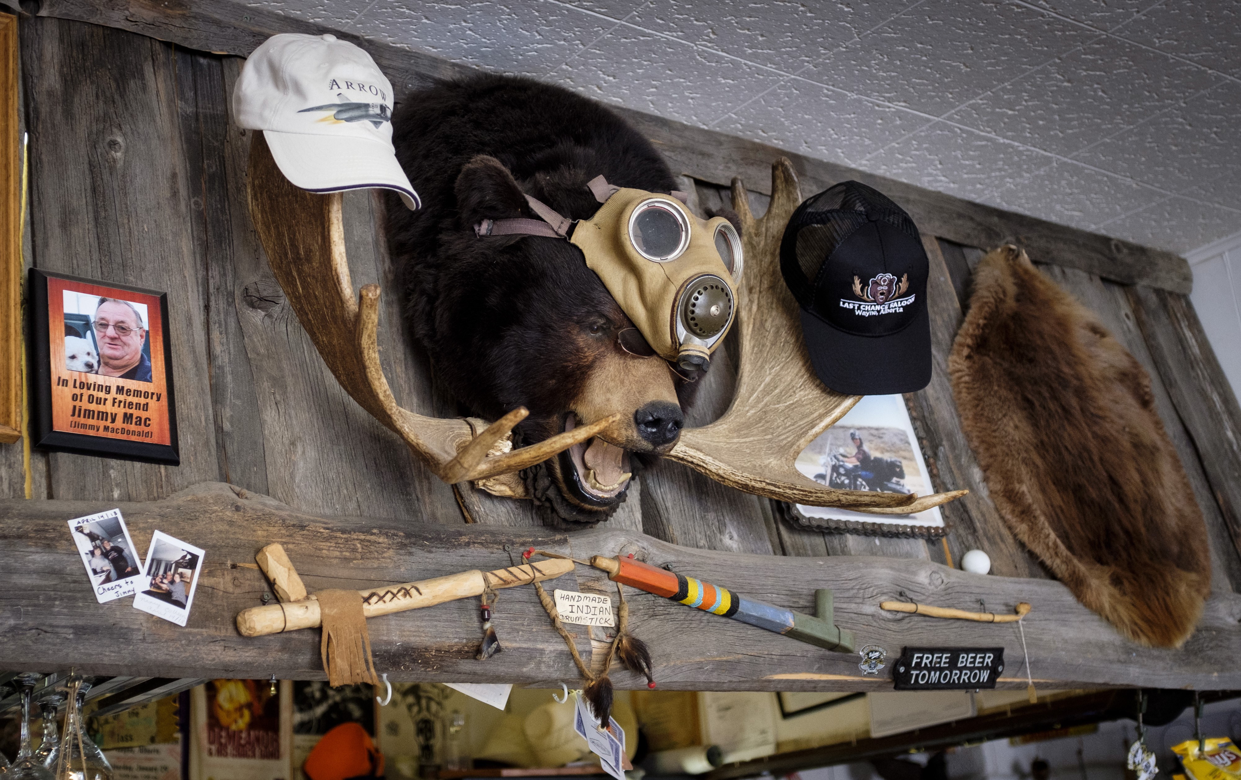 The saloon is also a living repository of kitsch, donated items including a ceiling-mounted bearskin rug, a stuffed boar’s head, an airplane model, an antique animatronic “Band Box” music player, mining equipment and postcards from Australia.