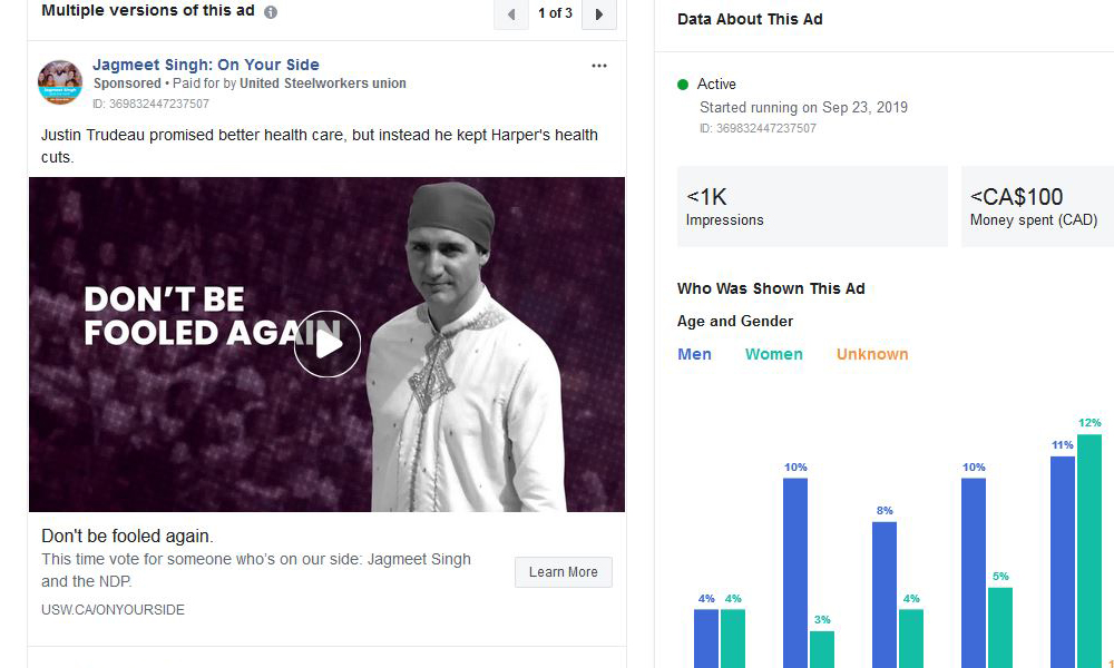 The United Steelworkers ($27,515) are explicitly backing the NDP in their ads. A set of negative ads about Trudeau seem to have been targeted at young men.