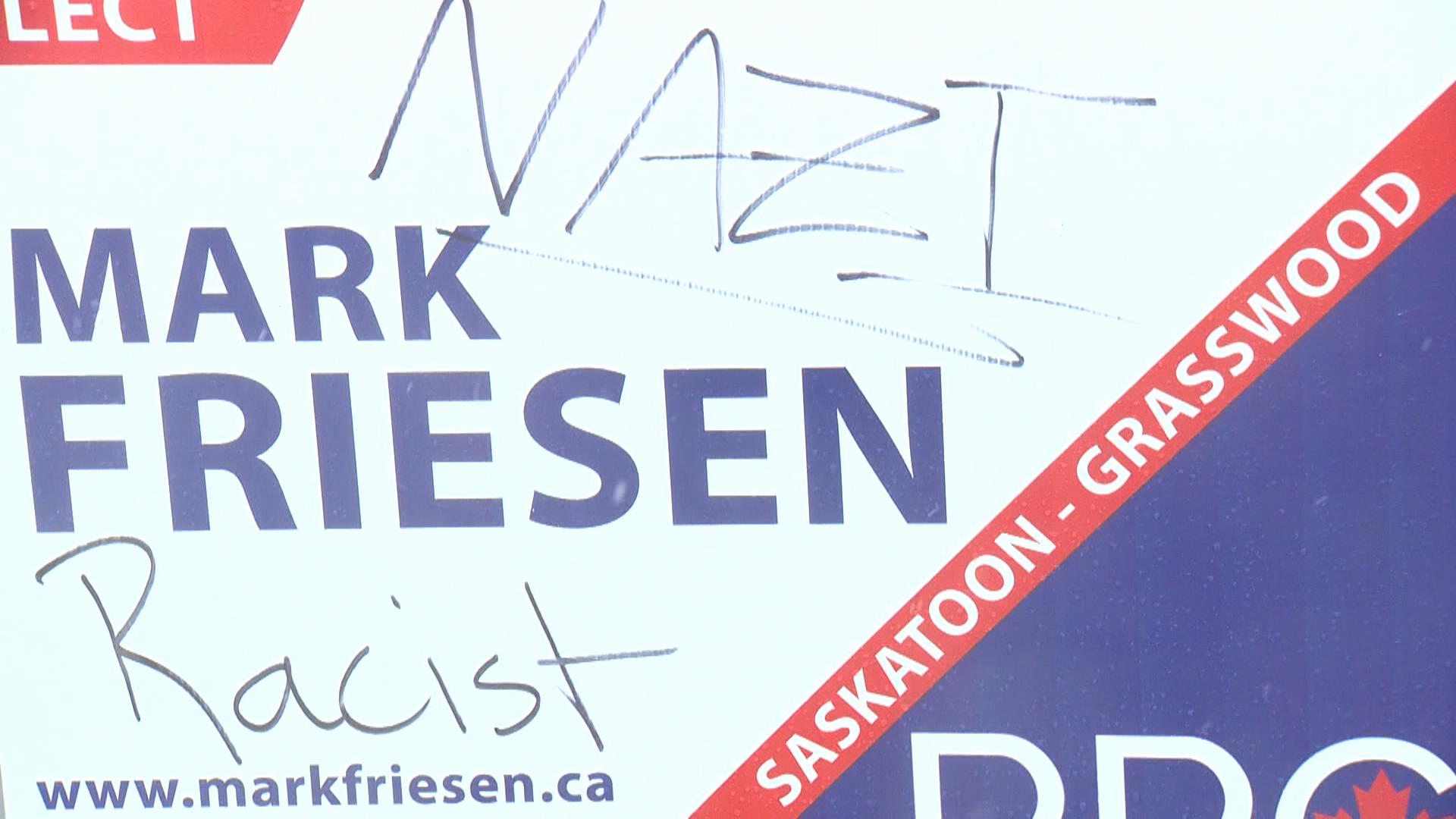 The PPC’s Saskatoon-Grasswood candidate said two signs were given to him by a neighbour and three others were also defaced.