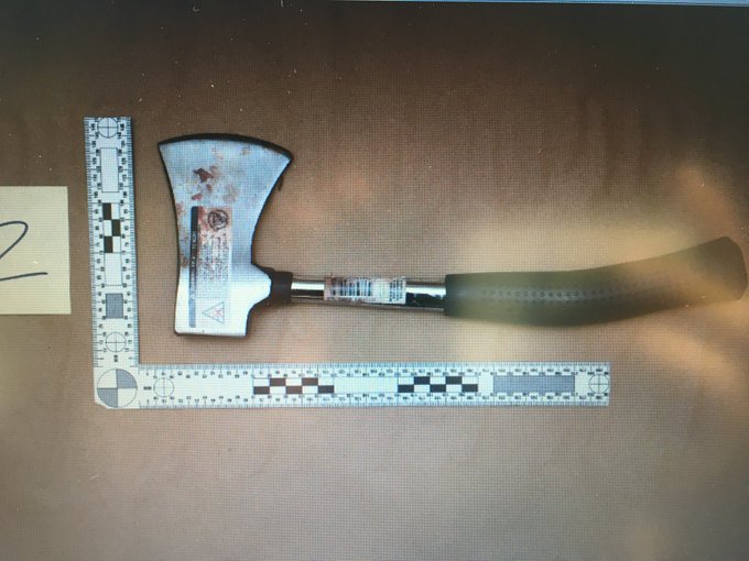 Photographs include a bloody hatchet that Crown says had the victims’ DNA on it, and which prosecutors allege is the same item Kam purchased in the video.