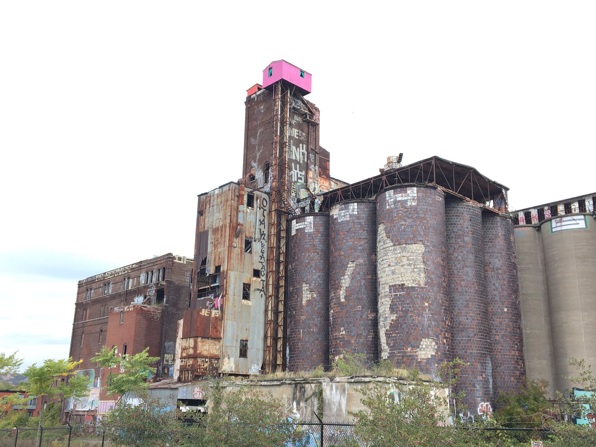Two old metal shacks perched atop the old Canada Malting Silos on the Lachine Canal in Saint-Henri have been painted bright pink and red. One even has dons green curtains.