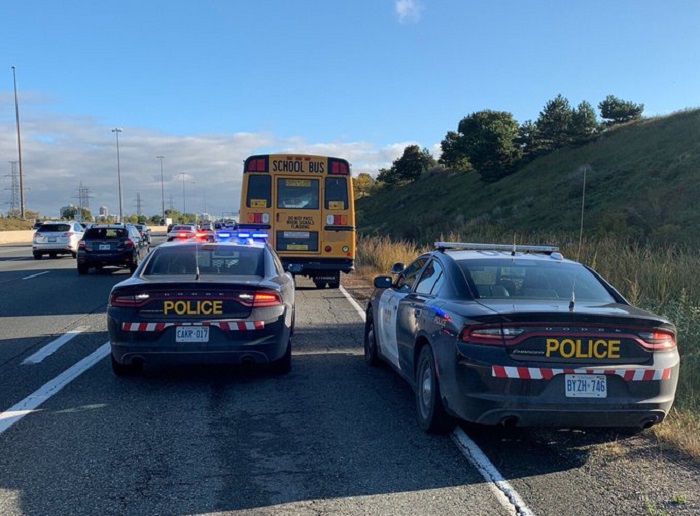 On Friday, a witness called 911 after seeing a school bus moving “all over the road” while driving eastbound on Highway 403 in Mississauga, Ontario Provincial Police Sgt. Kerry Schmidt told Global News.