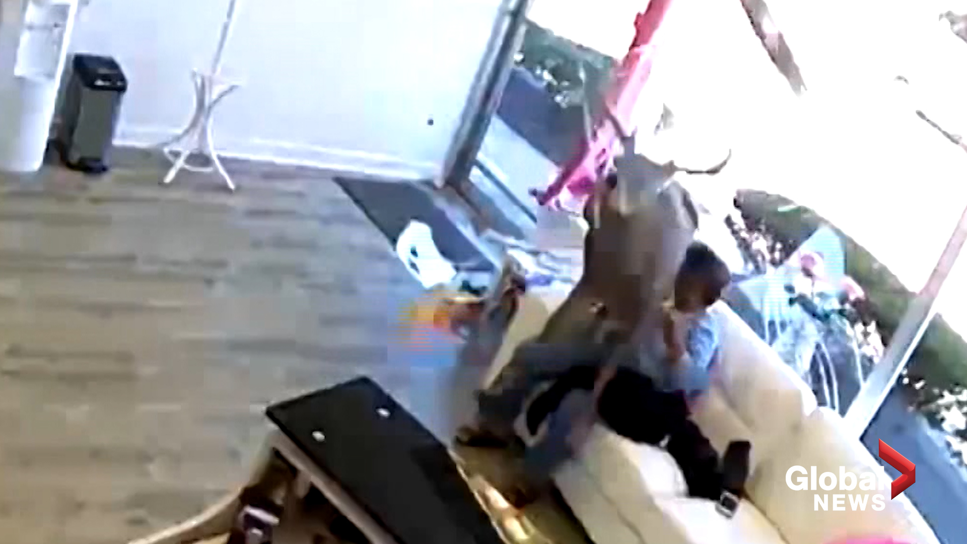 The deer is seen careening through the front window and out of frame towards the back of the salon as a woman’s voice screams “Oh my god! Oh my god!”