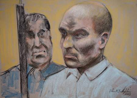 Bertrand Charest is seen on a court drawing during a bail hearing in St-Jerome, Que., on March 16, 2015. THE CANADIAN PRESS/Mike McLaughlin