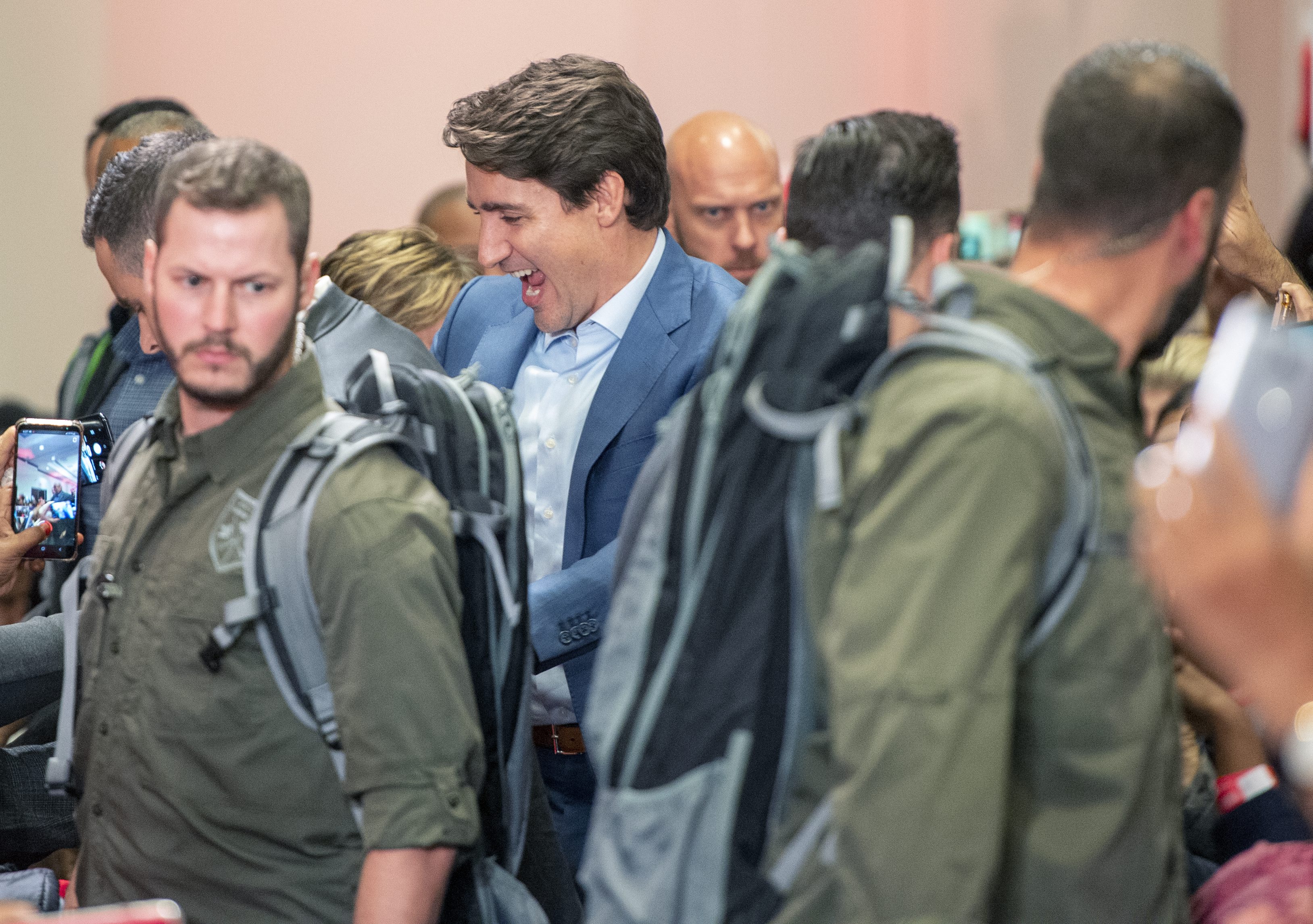 Trudeau’s extra security detail was obvious as the Liberal leader was escorted through the boisterous crowd by a large number of plainclothes RCMP officers as well as Mounties dressed in green tactical gear.