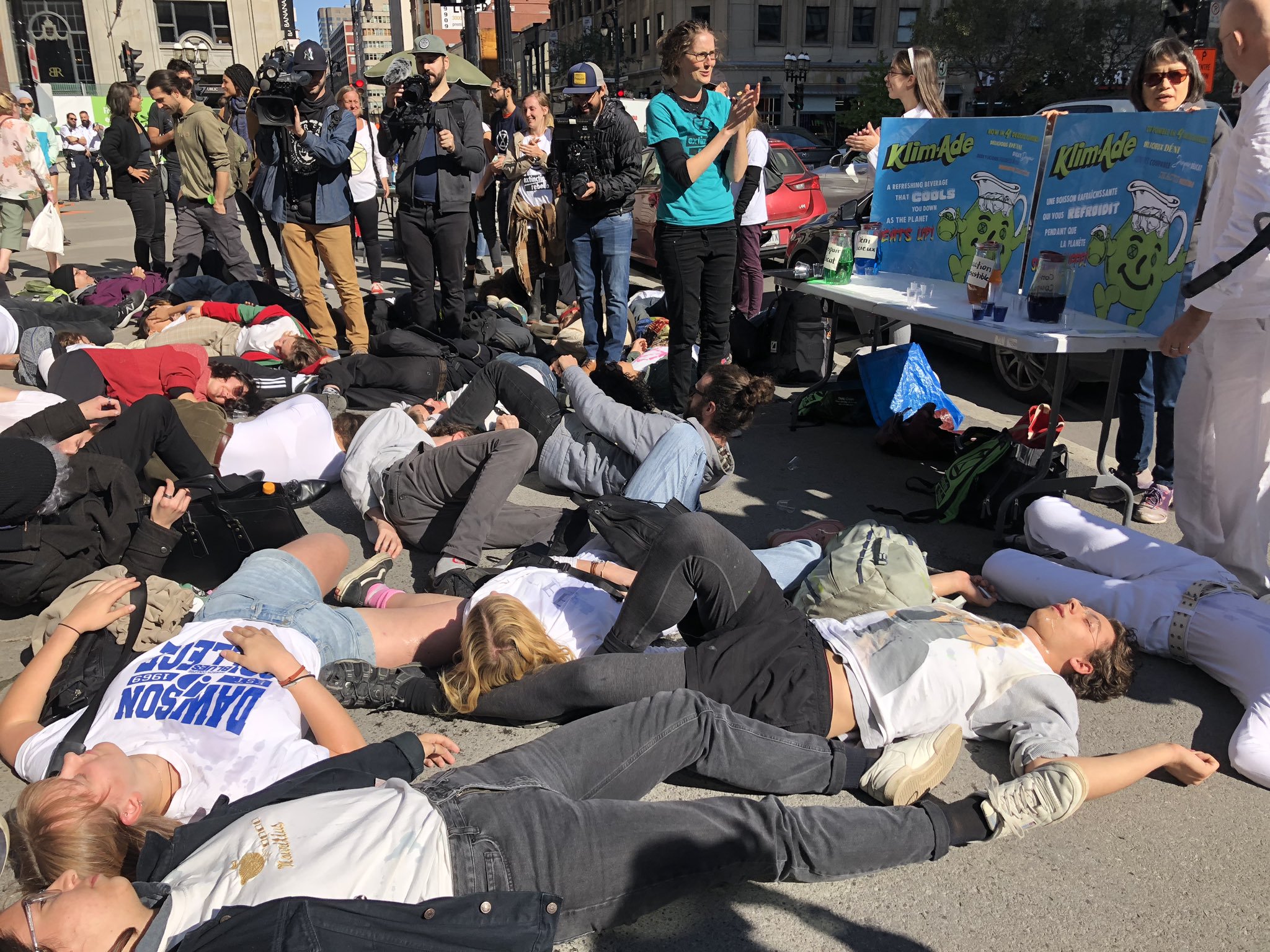 The group known as Extinction Rebellion rallied approximately 50 people to perform a “die-in” — demonstration in which people drop to the floor to imitate dying — on Ste. Catherine Street at the corner of McGill College.