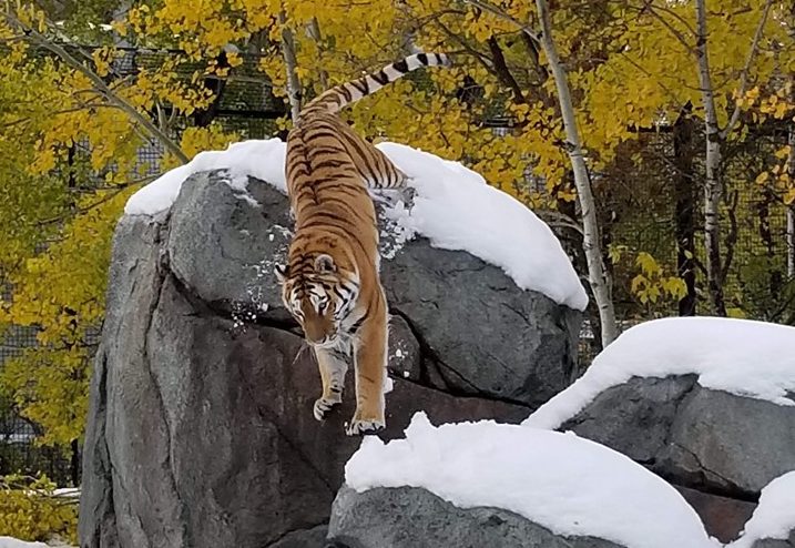 One of the tigers leaps from a snowy rock at the Assiniboine Park Zoo. Zookeeper Jacquie/Assiniboine Park Zoo