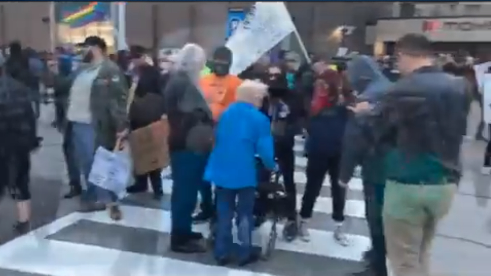 One of the protesters blocking the senior with a walker from getting by was the masked son of the family that owns the restaurant. There is a solid line between peaceful demonstration and what these folk were up to. Check out the video at the top (and be warned that it contains explicit language.)