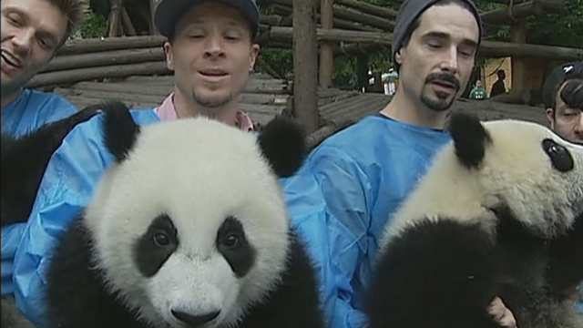 American pop group The Backstreet Boys got the opportunity to meet and play with giant pandas in Chengdu, capital city of southwest China’s Sichuan Province. The band got the chance to hold and feed the pandas, and even serenaded the animals while cradling them. This year marks the 20th anniversary of the founding of the group, who as part of their 2013 world tour will hold a concert in Chengdu on Friday night.