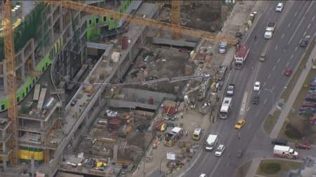 According to AHS, the boom went through a glazed panel at the site, which is currently under construction