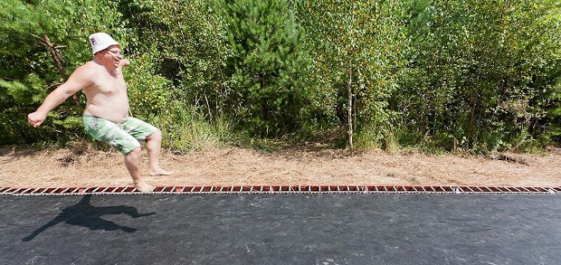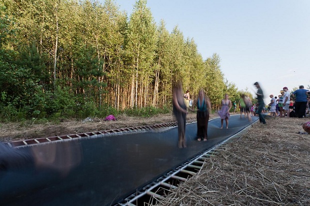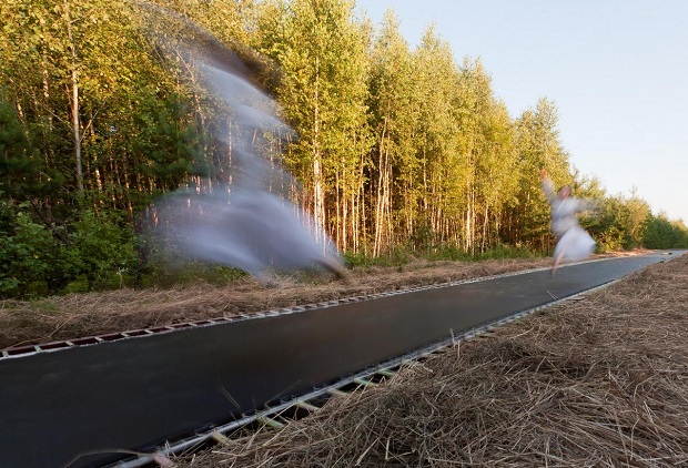 Called the “Fast Track,” the 170-foot-long trampoline looks uncannily like a conveyor belt stretched out among the trees – but instead of standing and being moved, people bounce to their destination.