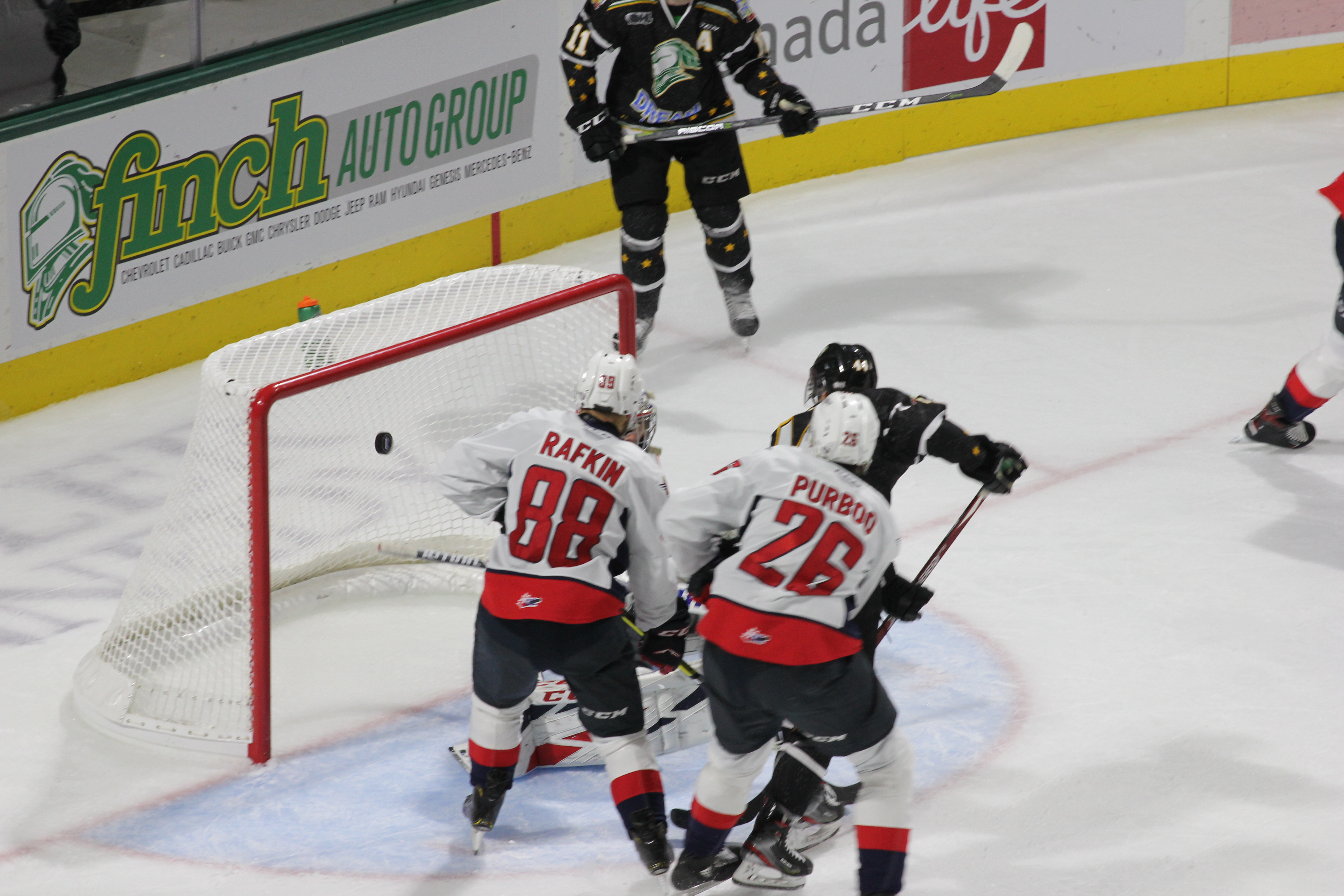 Angle added his second as he knocked a puck out of the air on left-wing, zoomed into the London end, cut across the slot and shot the puck between his legs for his ninth goal of the year.