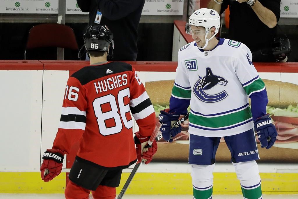NEWARK, N.J. (AP) — Jack Hughes scored his first career goal in his first NHL game against his older brother Quinn Hughes, helping the Devils top the Canucks.