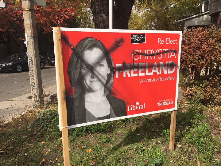 Election campaign signs for Liberal candidate Chrystia Freeland have been defaced in one of Toronto’s midtown neighbourhoods.