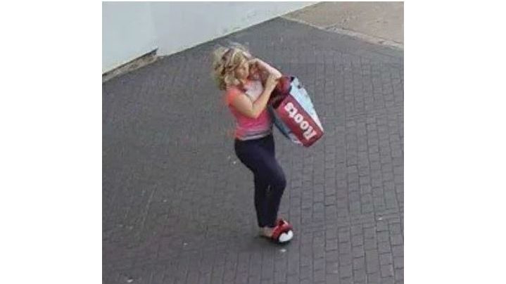 According to police, the suspect is described as a five-foot-five woman in her 30s wearing a blonde wig, sunglasses, blue leggings, penguin slippers and a burgundy vest over an orange and pink T-shirt.