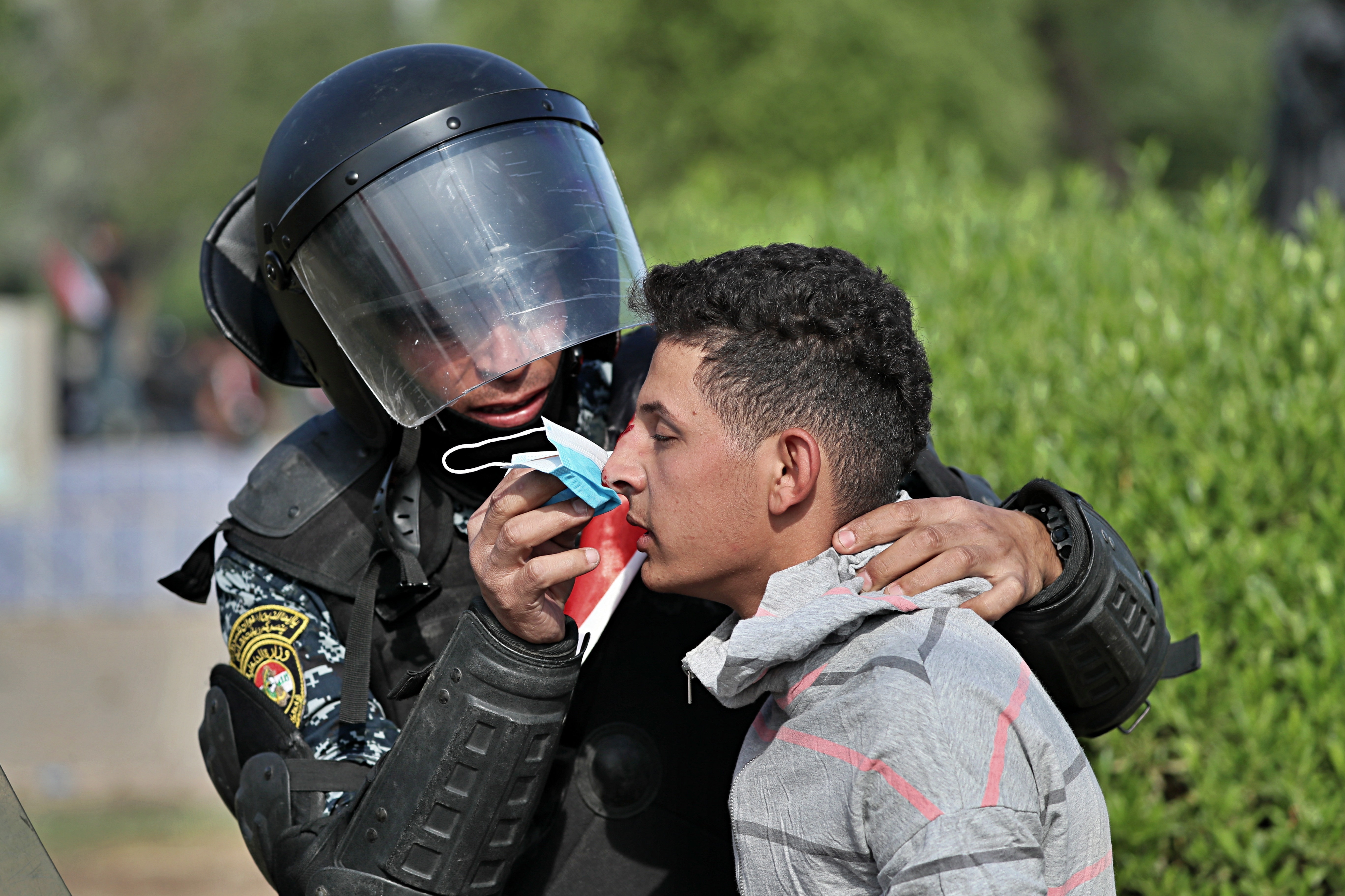 Sirens wailed and tear gas canisters landed in the middle of groups of young protesters wearing Iraqi flags and chanting “with life and blood we defend you Iraq.”