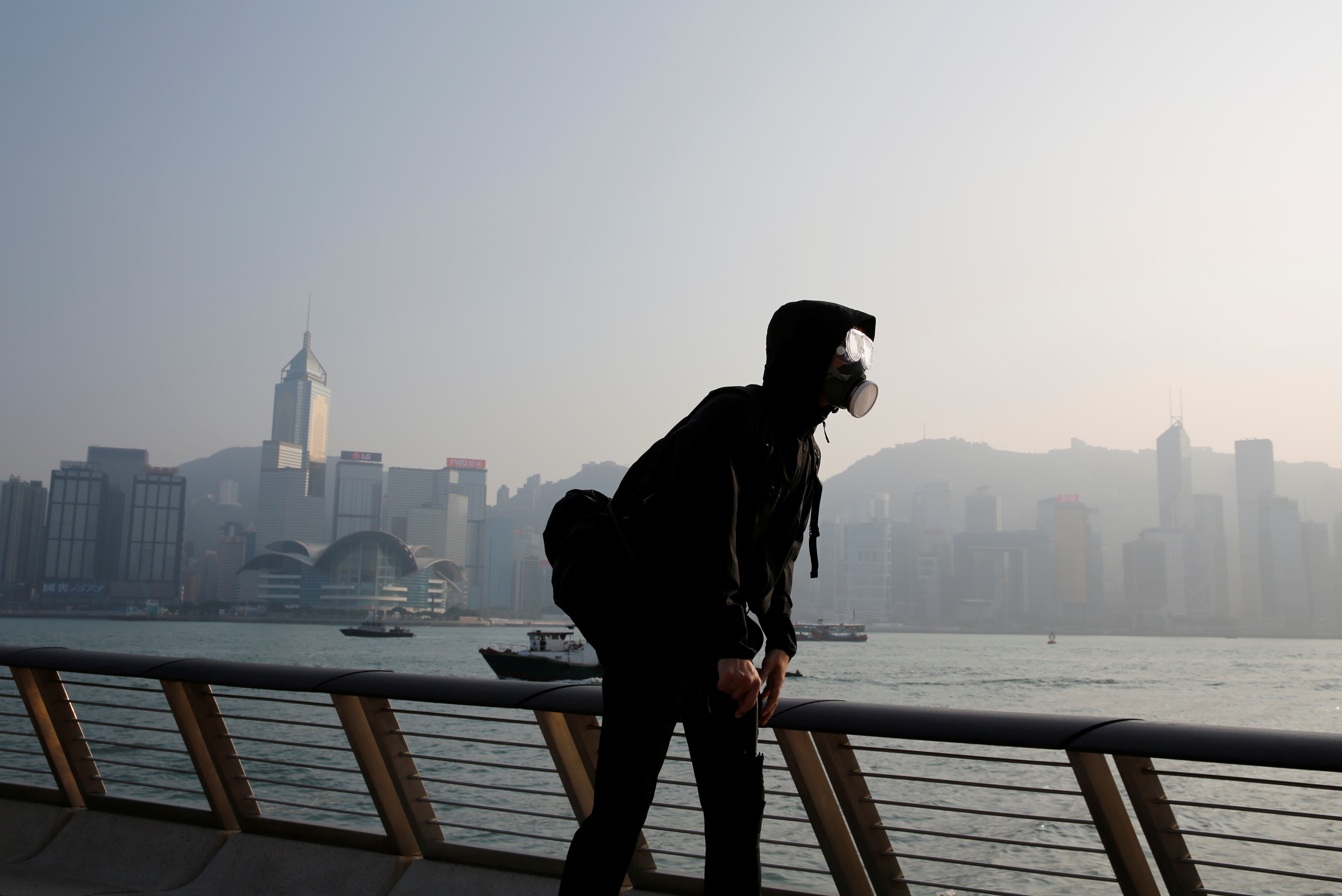 Pictures circulating online suggested she was wearing a gas mask, to protect against tear gas and pepper spray. Ordinary face masks were banned this month under a resurrected colonial-era emergency law.