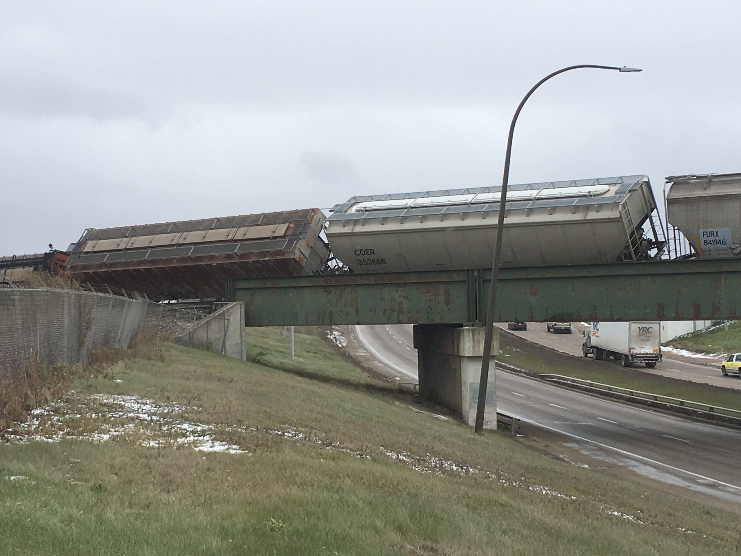 12 cars of a CN train were derailed or leaning on their side on the Lagimodiere overpass near Dawson Road, stopping northbound traffic on Lagimodiere Boulevard Friday afternoon.