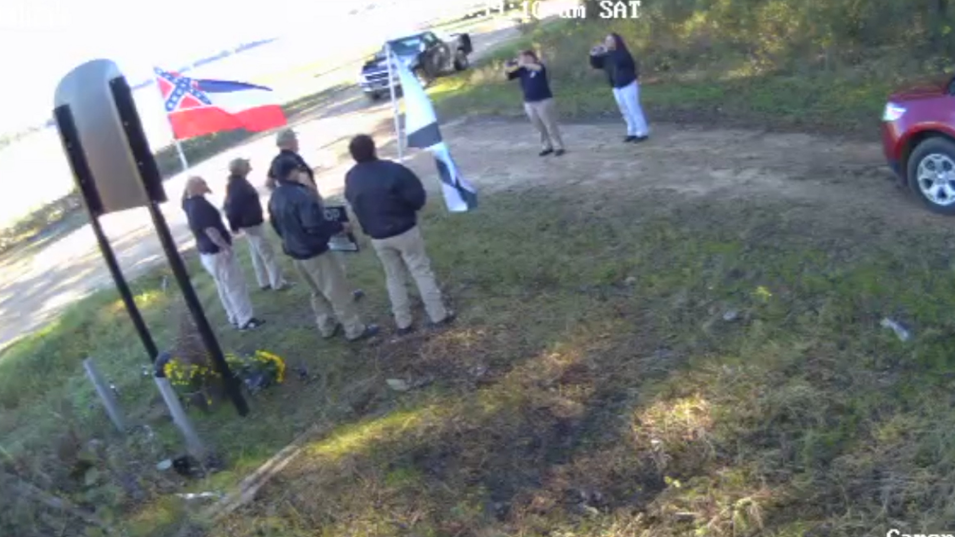 Patrick Weems, executive director of the Emmett Till Memorial Commission, told The Associated Press that the incident was captured Saturday by new security cameras at the memorial site in Mississippi. Security video from the commission shows the people, including a person carrying the flag of a neo-Confederate group flag, filming at the site. They are seeing running away after a security alarm sounds.