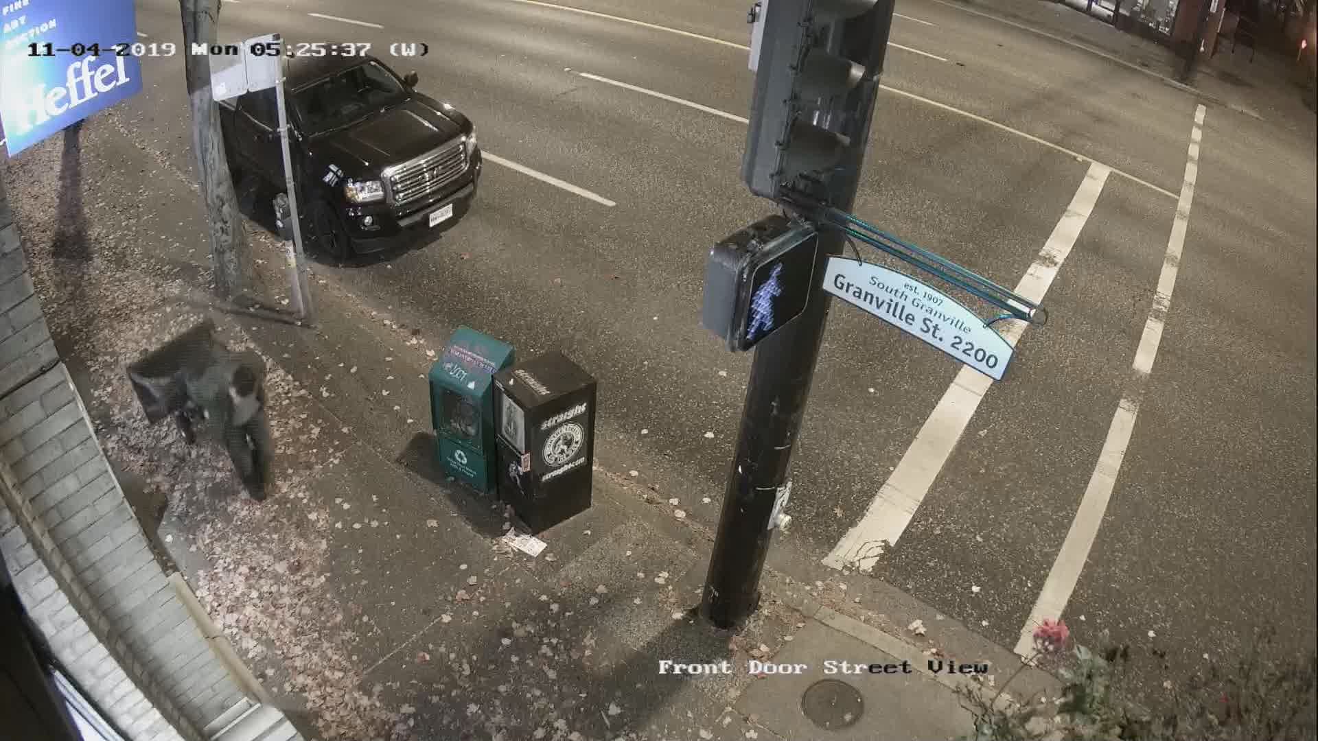 Security video captured by a neighbouring gallery depicts a man dragging the statue out of the gallery entrance, loading it onto a dolly, then towing it around the corner and through a nearby parking lot.