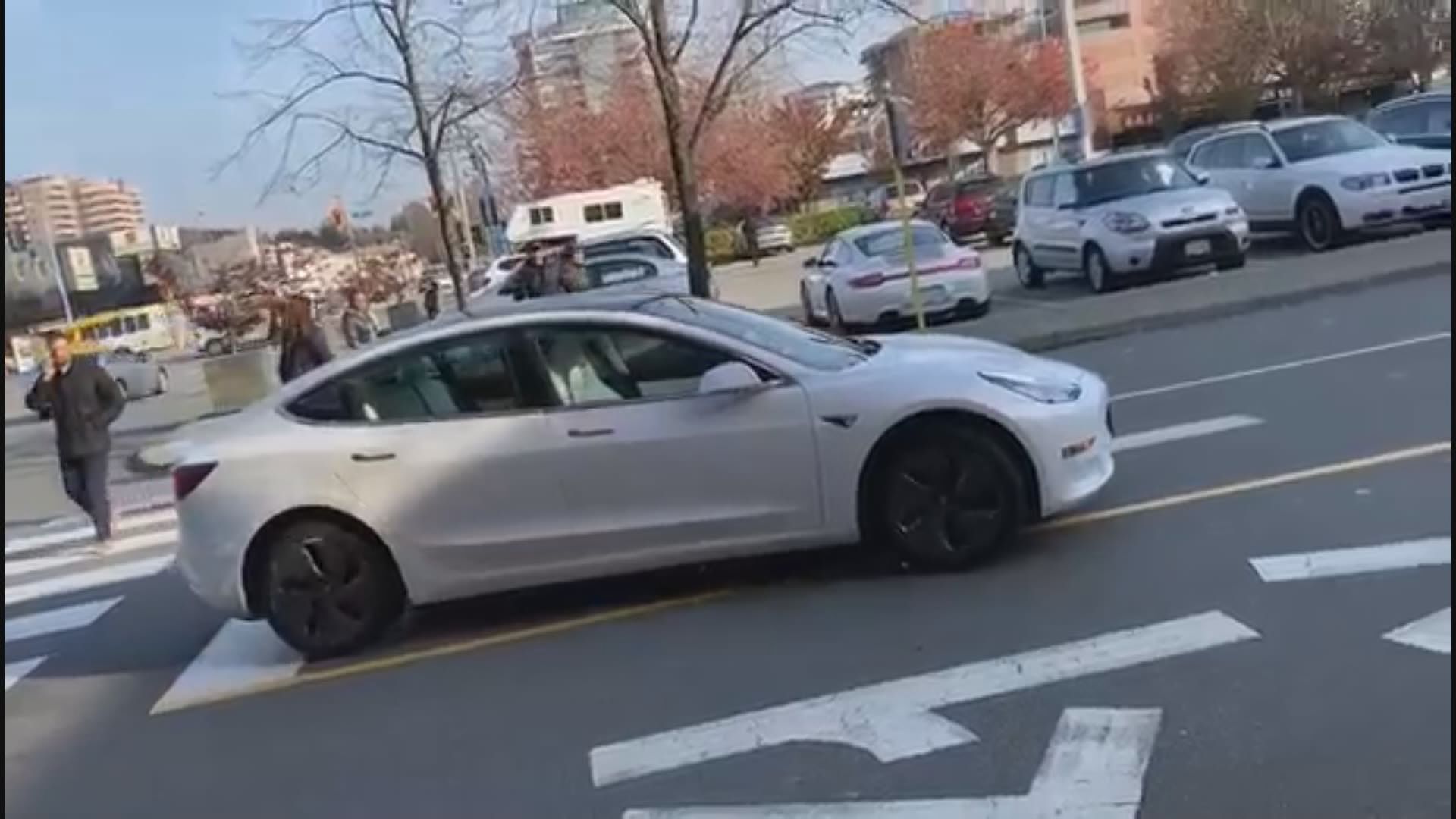 The footage, shot Monday and initially published by the Richmond News, shows a white, unoccupied Tesla hesitantly driving through the parking lot of Richmond Centre.