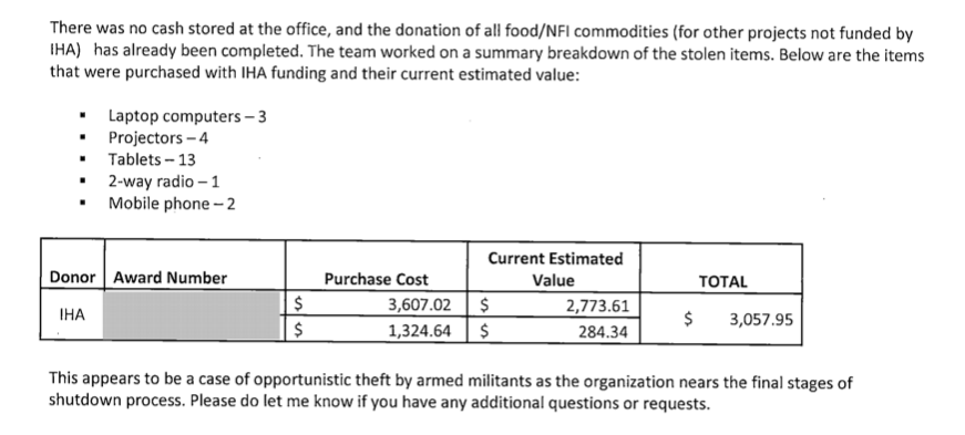 “Given the value of the equipment that was taken from that office and given the fact that terrorist groups also need to run logistics, just like humanitarian organizations do, that could actually be significantly more valuable to the terrorist organization from a tactical and logistical perspective,” she said.