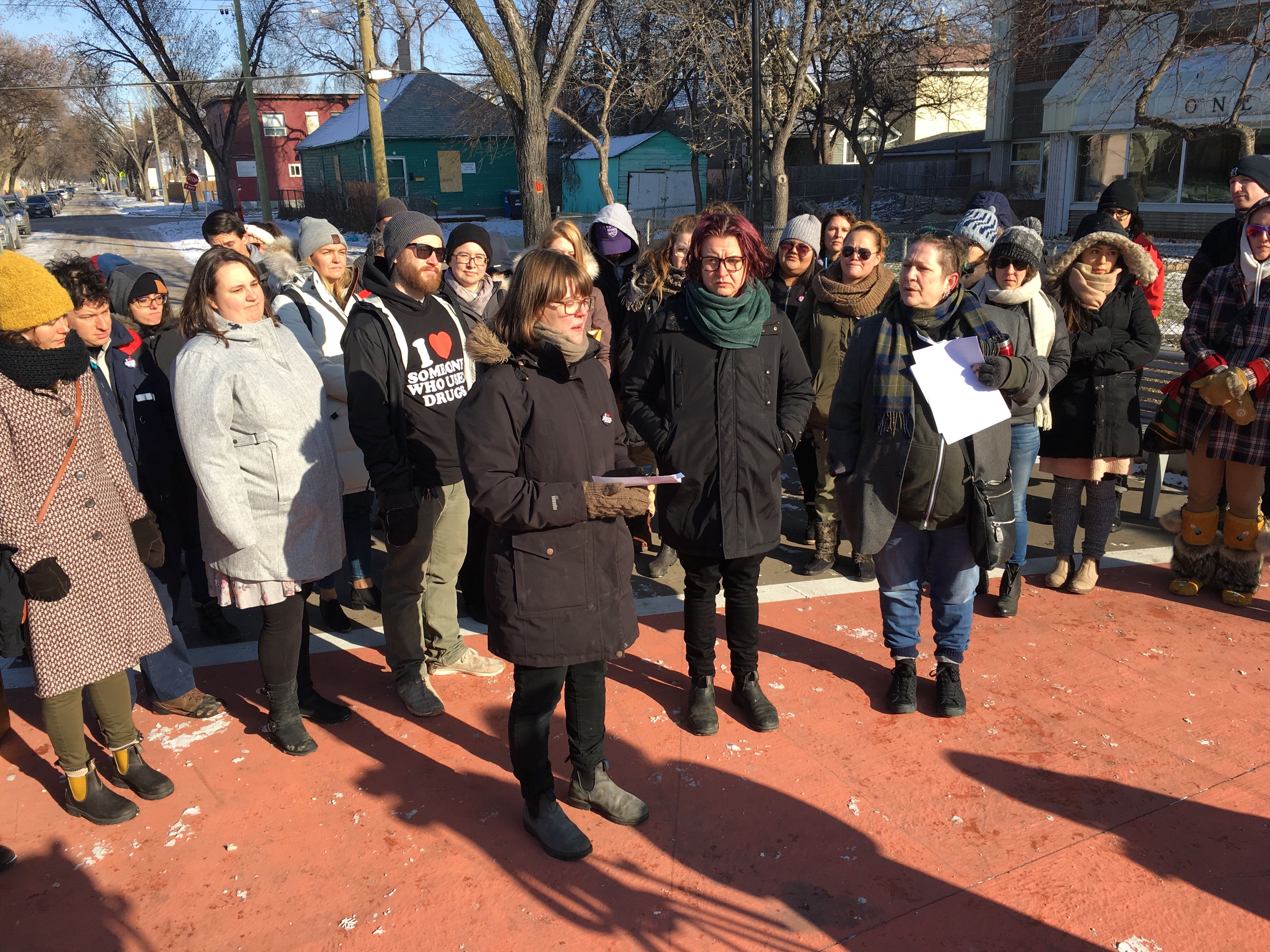 The group of residents and community workers gathered at the Bell Tower on Selkirk Avenue Thursday to voice their call to action.