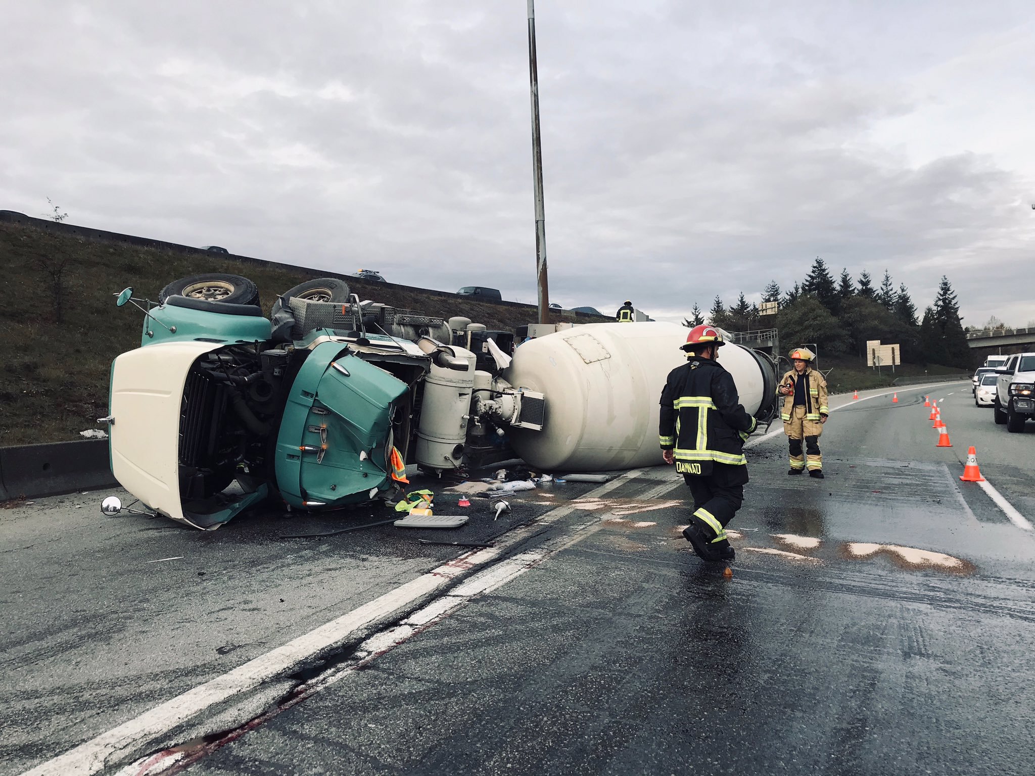 A cement truck crash on Highway 1 close to the Second Narrows Bridge added to the chaos faced by commuters to and from the North Shore Thursday evening.