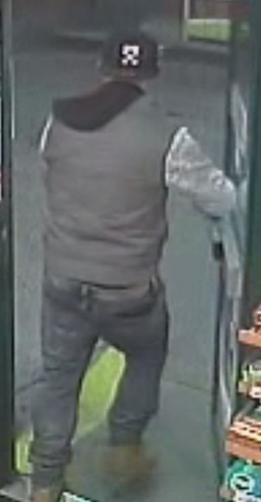 The suspect was last seen wearing jeans, a two-tone grey and black jacket, a black baseball cap with a white diamond logo and a sticker still attached to the outer brim.