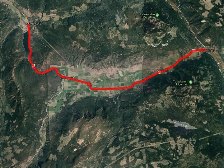 UPDATE: Highway 97 between Falkland and Monte Lake has been reopened to traffic.