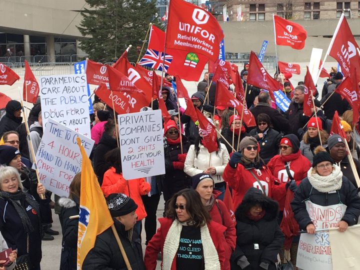 The Ontario Health Coalition advocacy group organized the protest to call on Premier Doug Ford’s government to stop what it refers to as “real-dollar” cuts to public hospitals, as well as plans to eliminate public health units and local ambulance services.