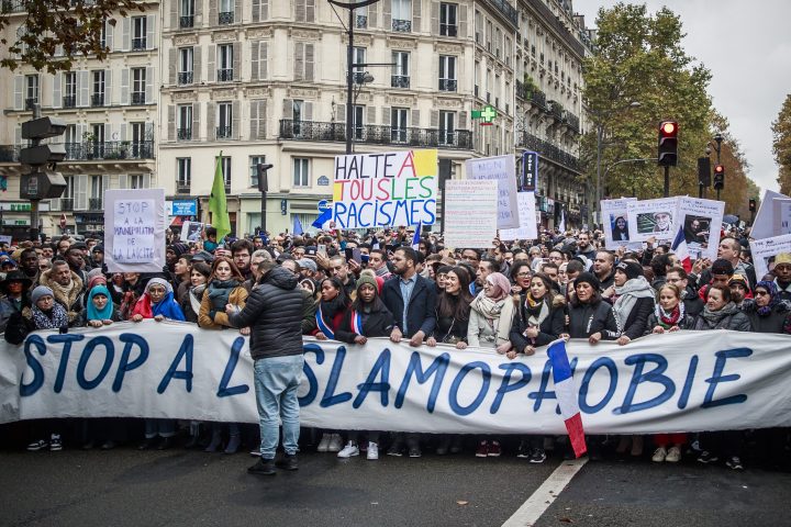 Crowds walked through the capital waving banners marked with the messages “Stop all racism” and “Islamophobia is not an opinion but a crime” at the event organized by the Collectif Contre l’Islamophobie en France.