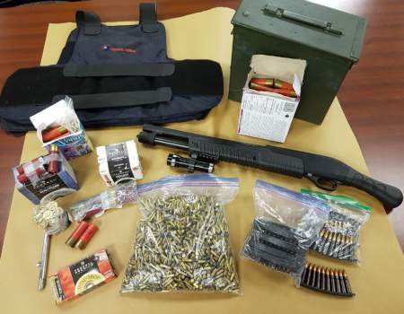 The search turned up two guns — a shotgun and a zip gun — and more than 1,700 rounds of ammunition, according to police. A ballistics vest was also reportedly seized.