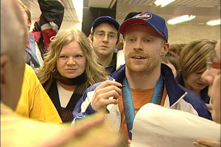 Donning a Winnipeg Jets baseball hat, the Olympian from Russell, Manitoba was all smiles as he showed of his medal and signed as many autographs as he could for his adoring fans.