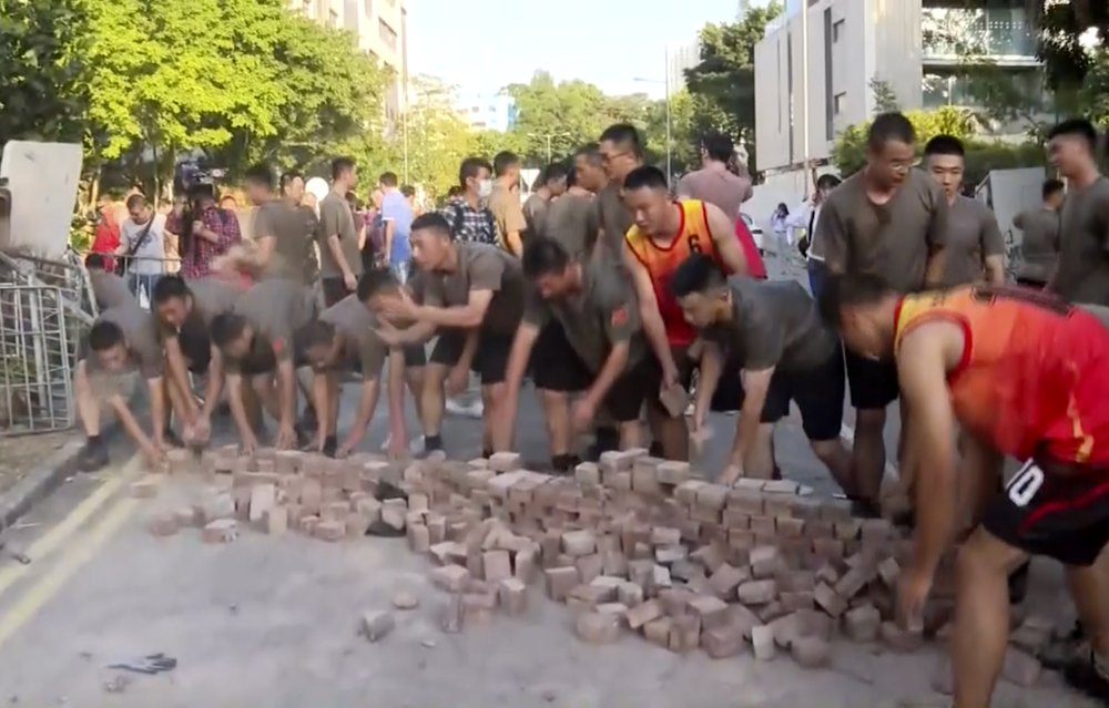 Dozens of Chinese troops, dressed in black shorts and olive drab T-shirts, came out from a nearby barracks to pick up paving stones, rocks and other obstacles that had cluttered the street and prevented traffic from flowing. Hong Kong riot police kept watch from nearby streets.