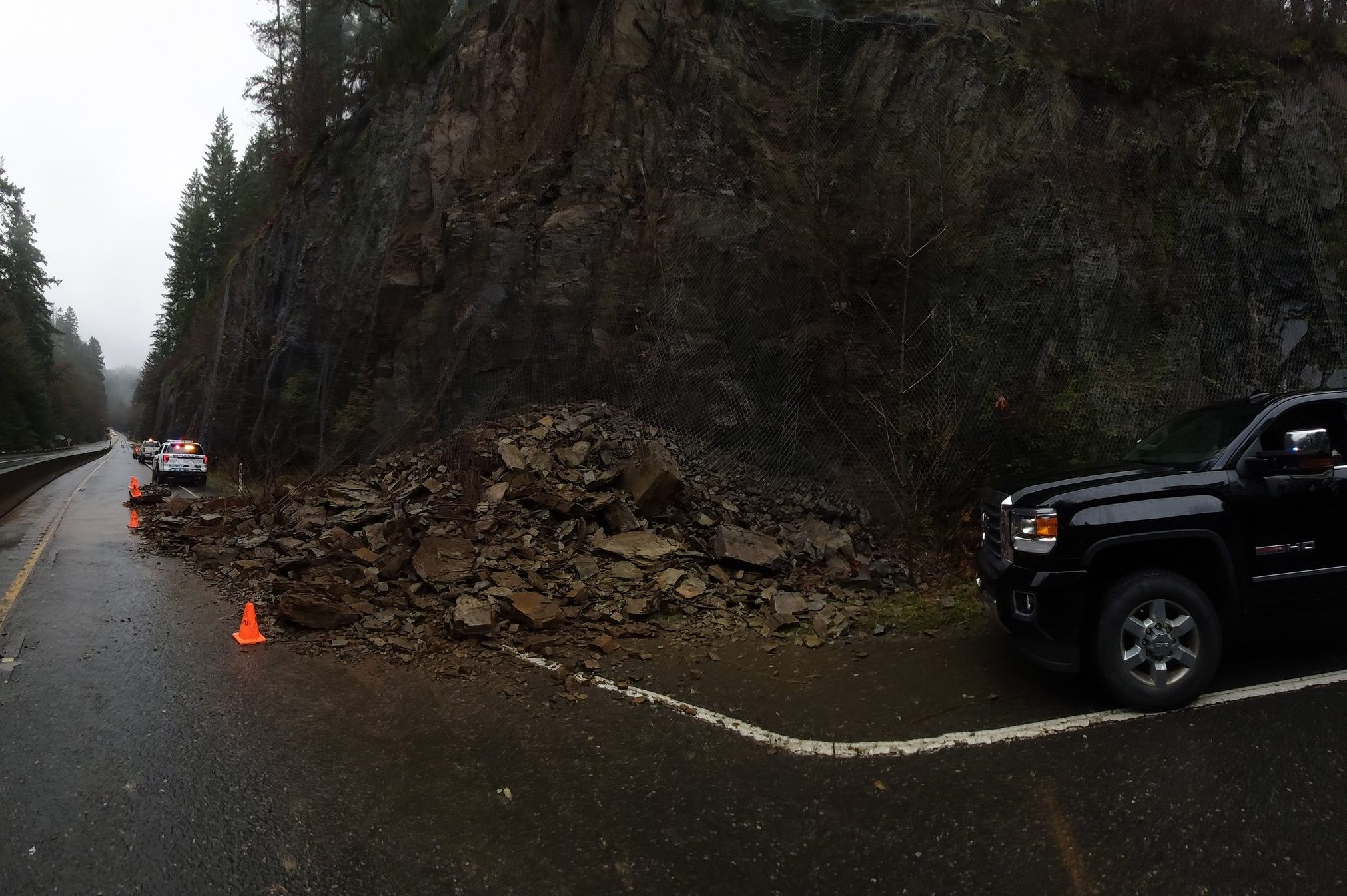 A loader and dump trucks were dispatched to clear the rocks from the road, and flaggers set up single-lane alternating traffic around the slide. Closures lasted 20 minutes at a time, causing long lines of traffic.