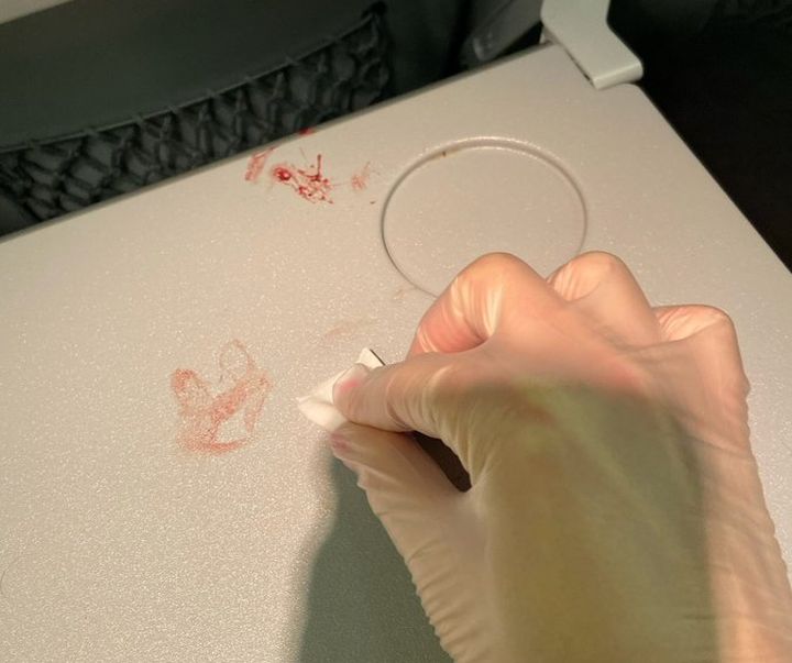 “I was like, ‘Hmm, that’s weird.’ So I popped open the table that folds down and there was more blood all over that,” she said Monday.
