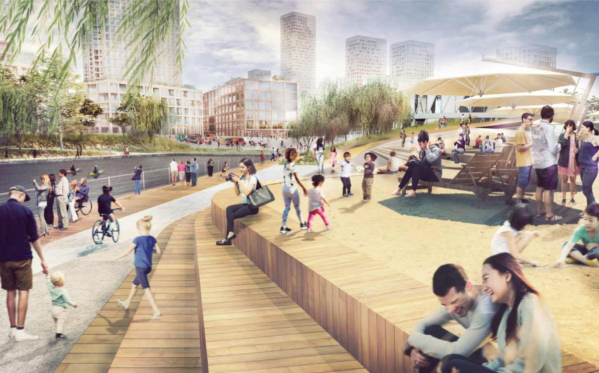 - Parks and open space: A “large and distinctive” park at the site’s west end that includes natural areas, manicured gardens, recreational amenities and views to the river.
