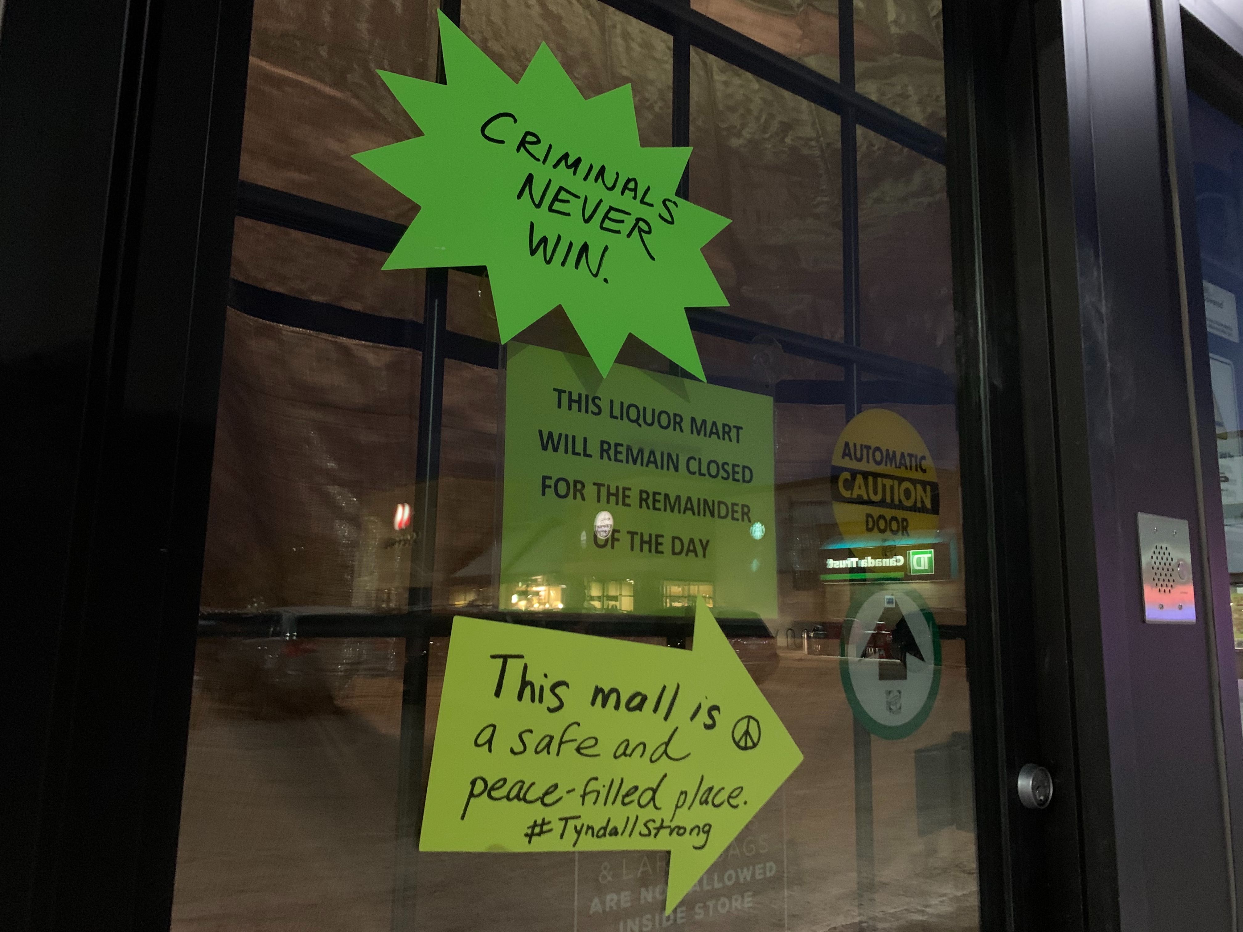 Signs of encouragement, hope and love were posted on a Manitoba Liquor Mart Thursday after employees were injured during an armed robbery, sending one woman to hospital.