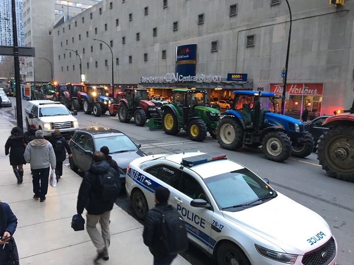 The demonstrators, on an impulse, decided to take their protest directly to CN headquarters in Montreal with a convoy of roughly 20 tractors, crossing the Jacques-Cartier Bridge Friday afternoon, to reach their destination on de La Gauchetière Street.