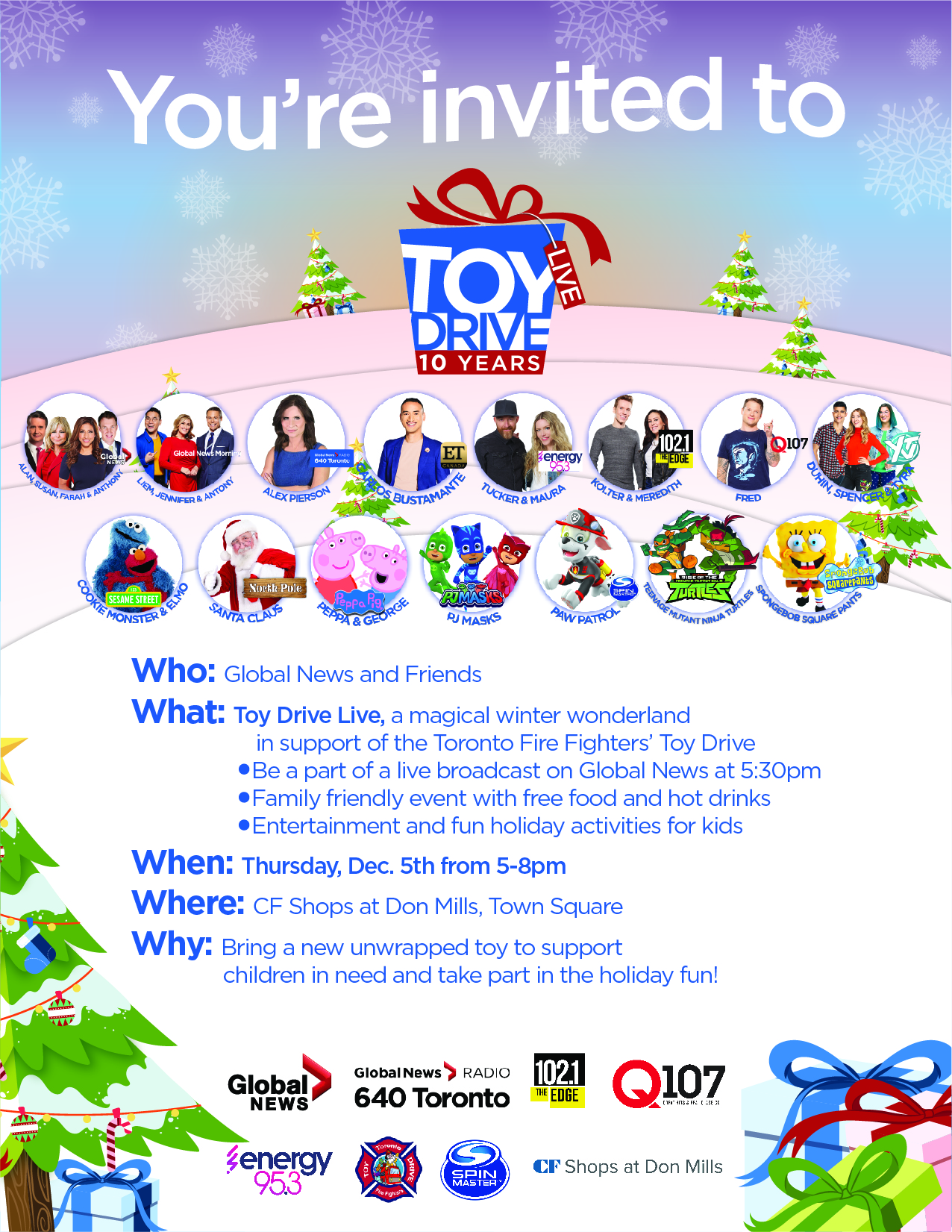 Toy Drive Live is set to celebrate its 10th year with Global News in partnership with the Toronto Fire Fighters at the CF Shops at Don Mills on Dec. 5.
