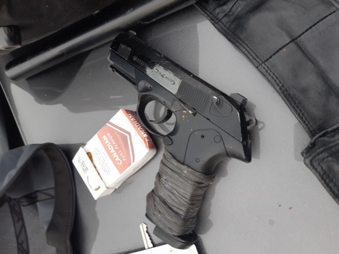 Two men were arrested at the time, police said. When officers searched the car, they found several weapons including a homemade gun.