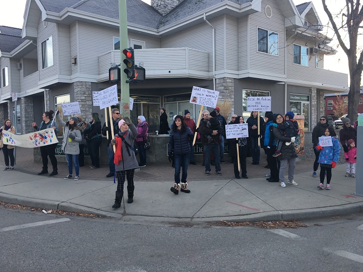 About three dozen people, mostly parents of children on the autism spectrum, gathered in front of the constituency office of Kelowna Liberal MLA Steve Thomson on Tuesday morning.
