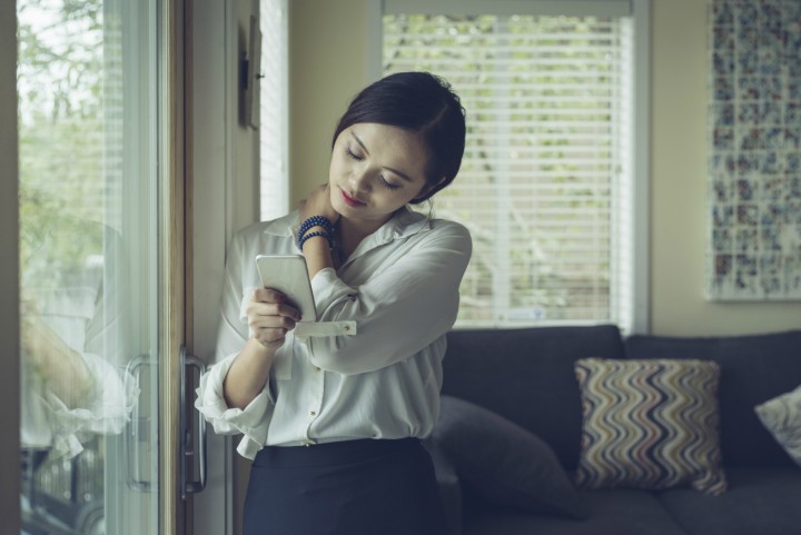 While looking at a smartphone, your head is bowed over — resulting in a tightness in your shoulders and the back of your neck, she said.