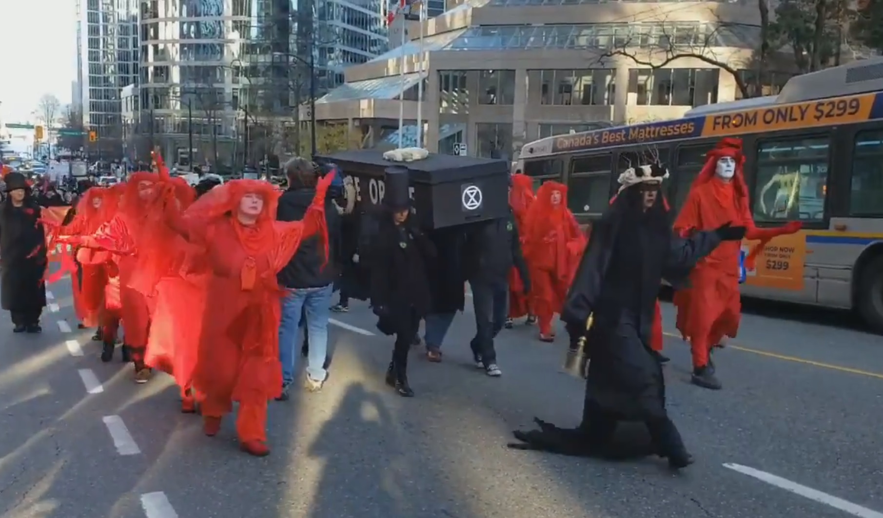 Environmental group Extinction Rebellion Vancouver organized the protest, which included a group of top hat-wearing pall bearers carrying a prop black coffin with “change or die” written on it through the streets and Pacific Centre Mall.