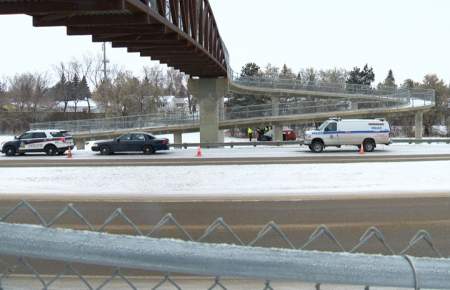 In a statement, Saskatoon police said a van struck a cement pillar of the pedestrian overpass near the Shaw Centre shortly before 4 a.m. Saturday.