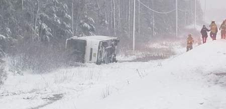 A bus carrying a Major Bantam hockey team from Berwick, N.S., slid off Highway 105 and rolled on its side in Queensville, Inverness County on Saturday.