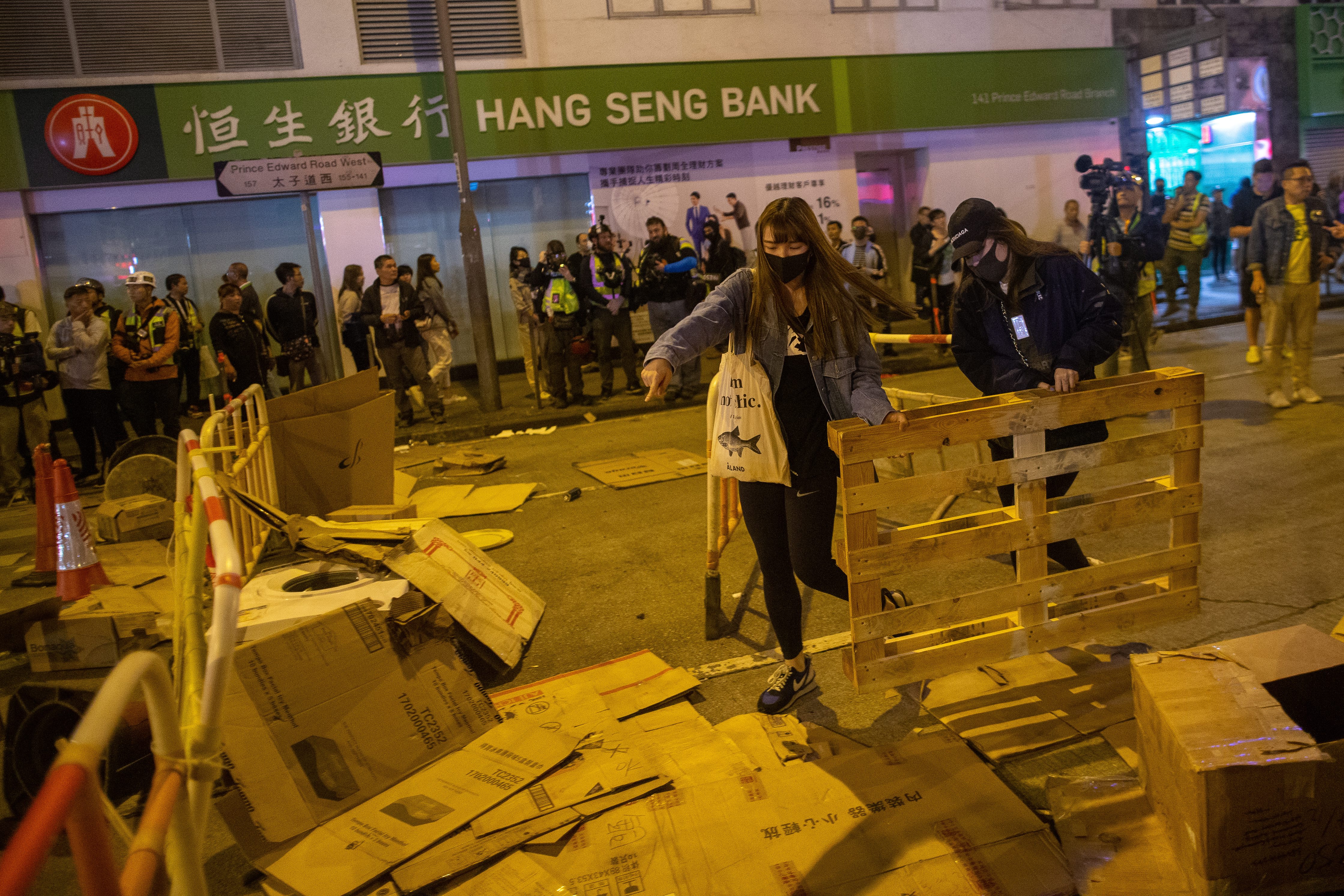 Some protesters returned to the streets Saturday night, using metal fences, cartons and bricks to block traffic in the Mong Kok area in Kowloon.