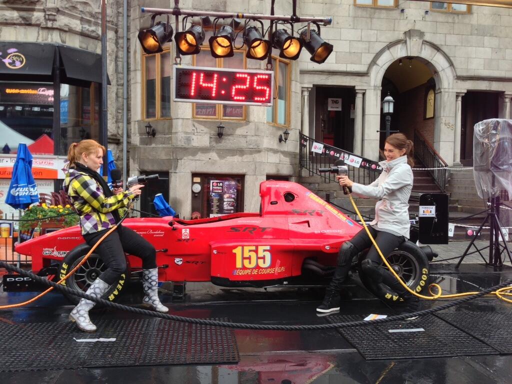 Montreal weather girls Jessica Laventure and TVA’s Emilie Brassard from Salut Bonjour battle away at the Pit Stop on Crescent Street.